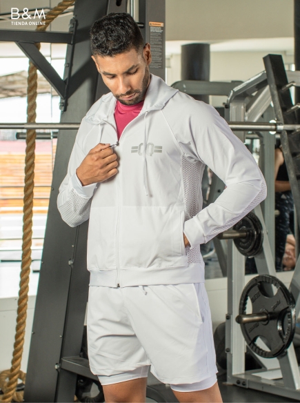 La chaqueta confeccionada con materiales técnicos te protege del viento y la lluvia, mientras que la camiseta de tejido transpirable te mantiene fresco y seco durante tus entrenamientos más intensos.